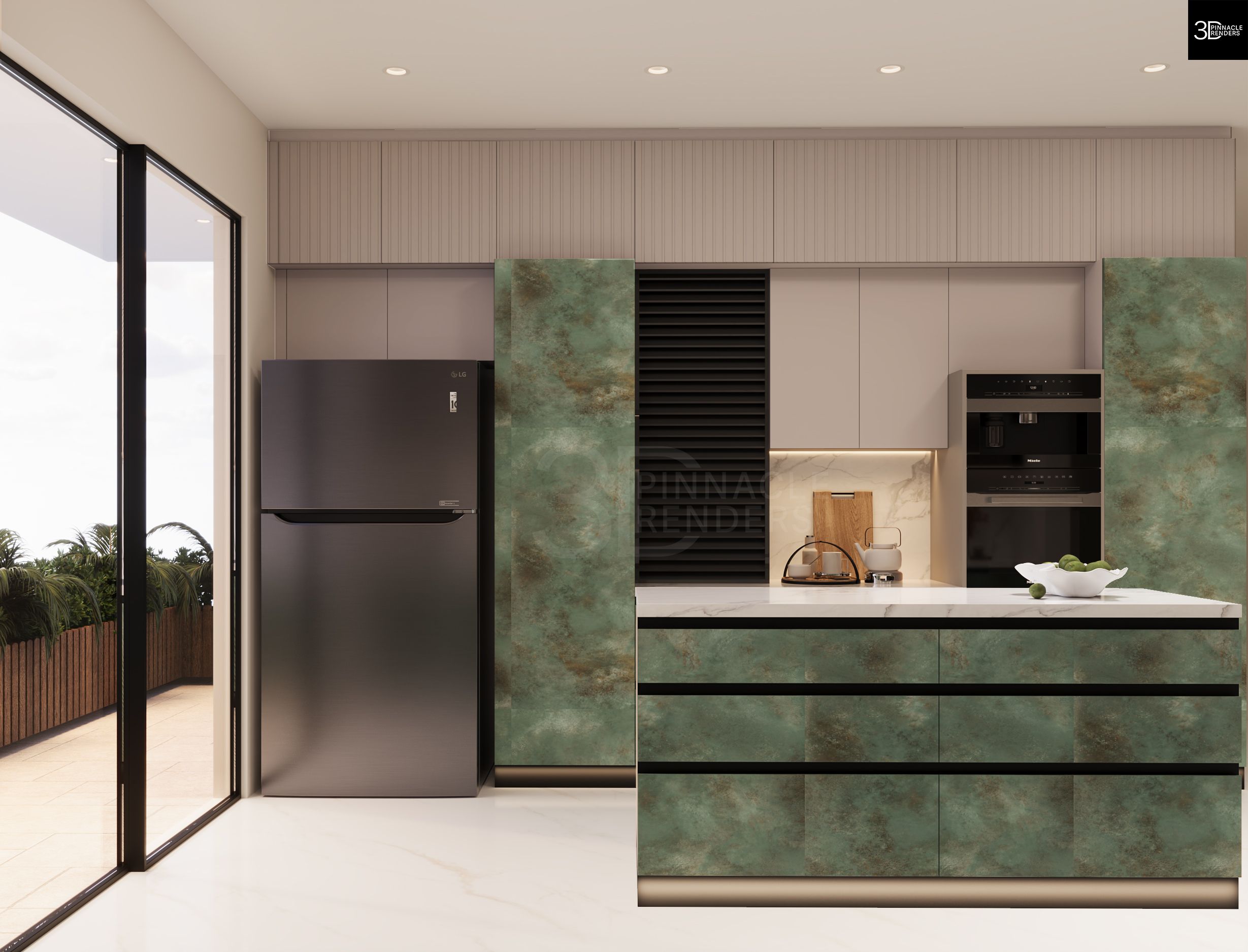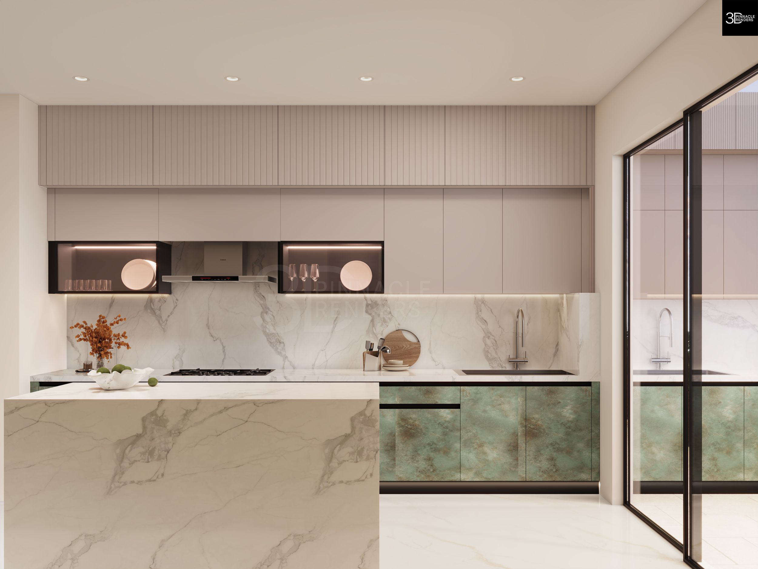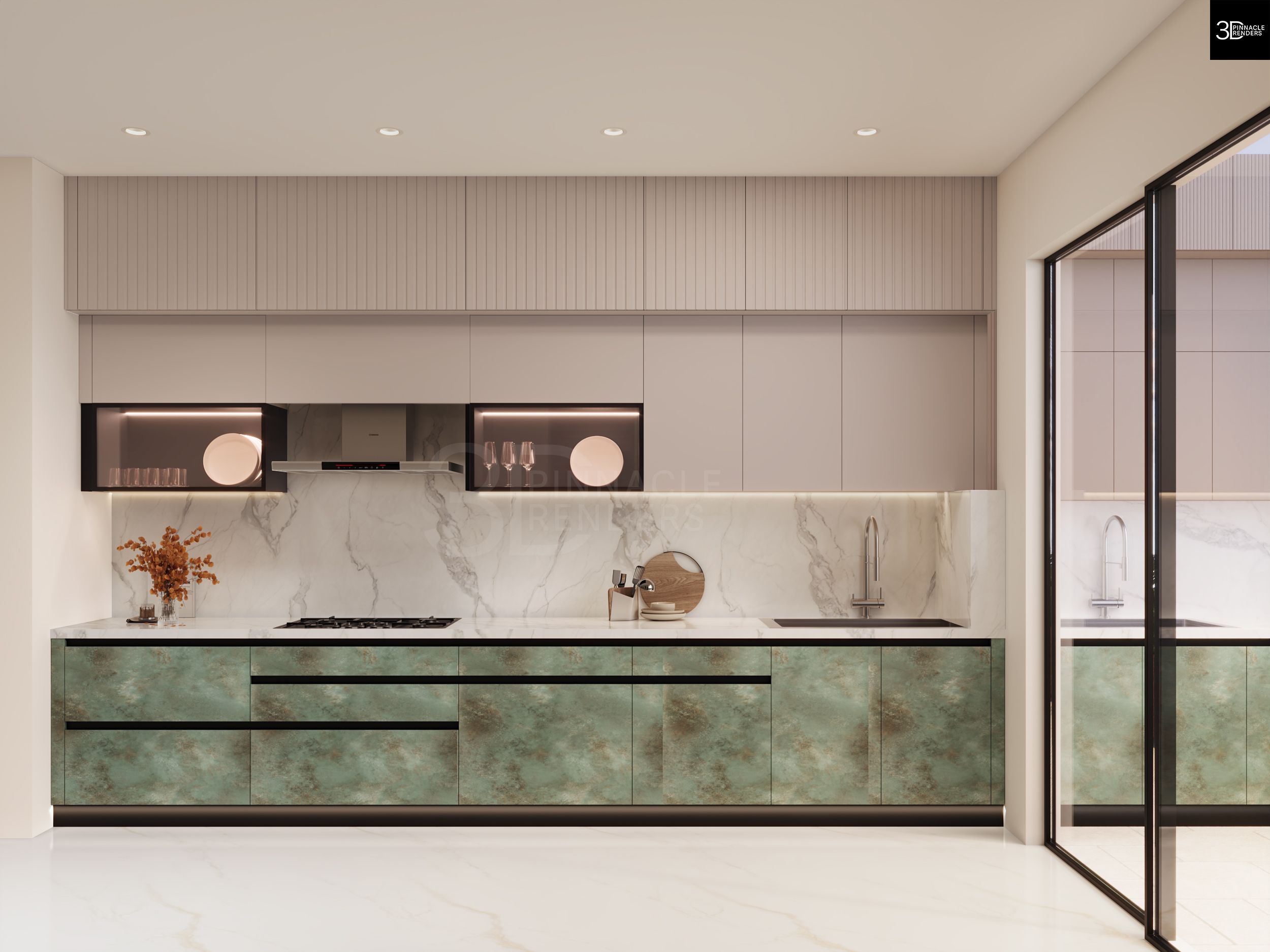 The design solution emphasizes visual continuity and material hierarchy. Light-toned upper cabinetry and marble surfaces enhance brightness and openness, while textured green lower units ground the space and add character. Integrated storage, handle-less fronts, and built-in appliances maintain clean lines and reduce clutter. Strategic lighting—both ambient and task-based—enhances depth, highlights material transitions, and reinforces the premium feel of the kitchen.